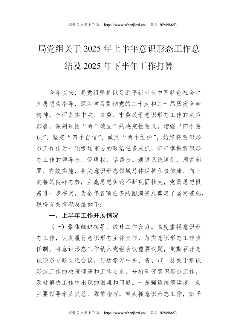 局党组关于2025年上半年意识形态工作总结及2025年下半年工作打算