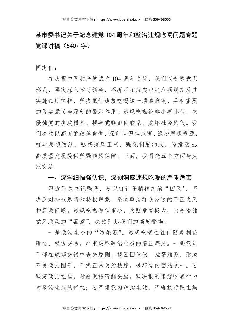某市委书记关于纪念建党104周年和整治违规吃喝问题专题党课讲稿(5407字)