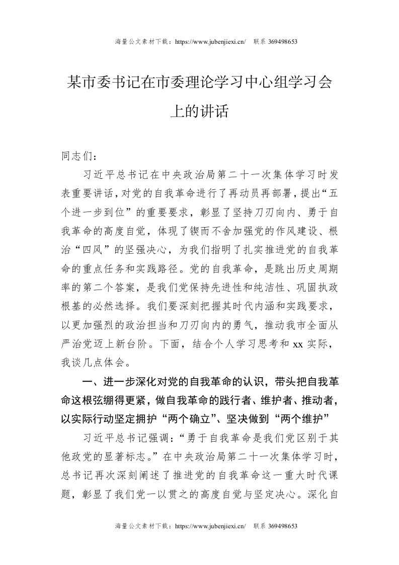 某市委书记在市委理论学习中心组学习会上的讲话