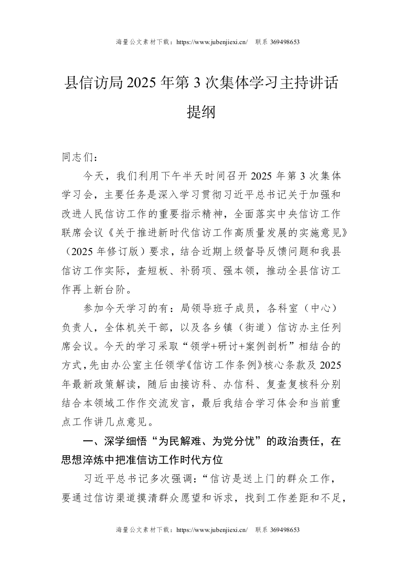 县信访局2025年第3次集体学习主持讲话提纲