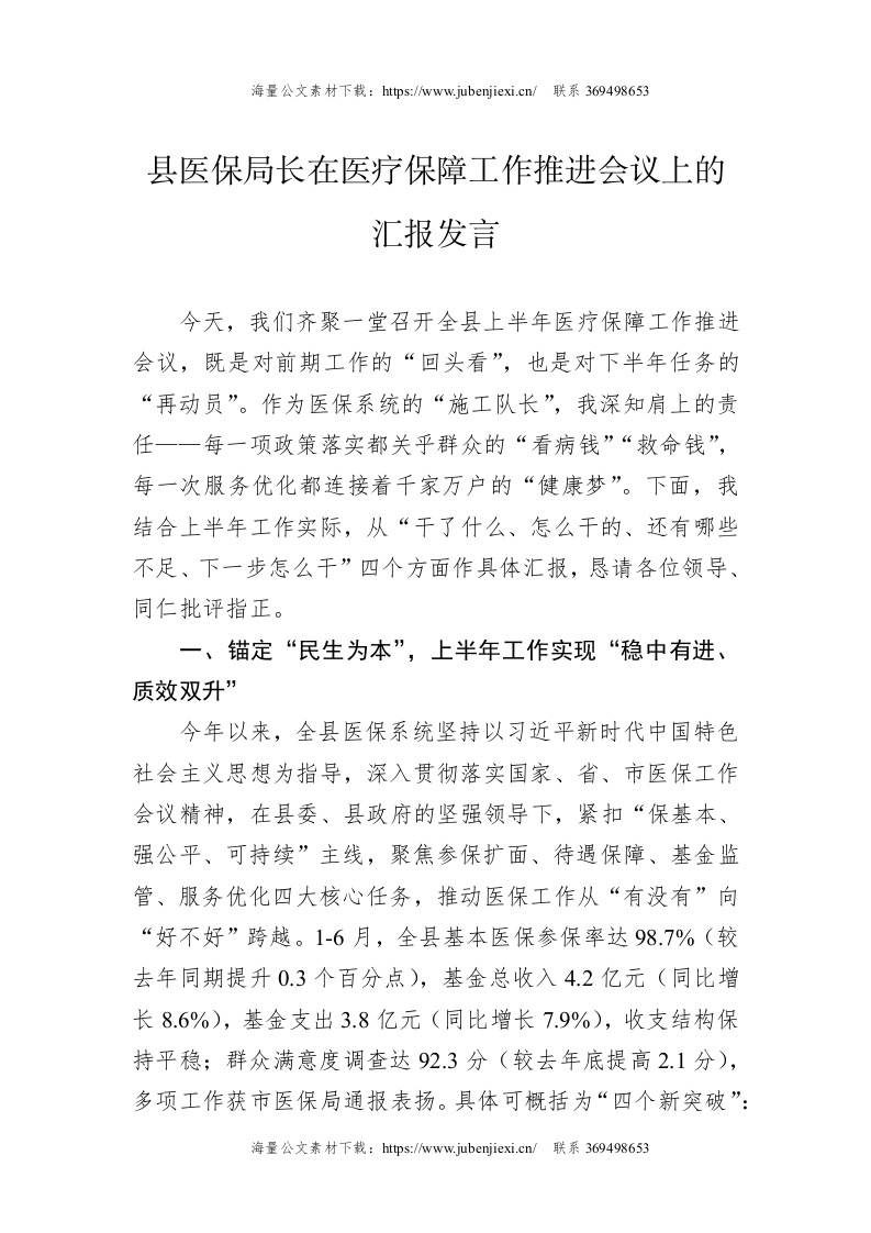县医保局长在医疗保障工作推进会议上的汇报发言
