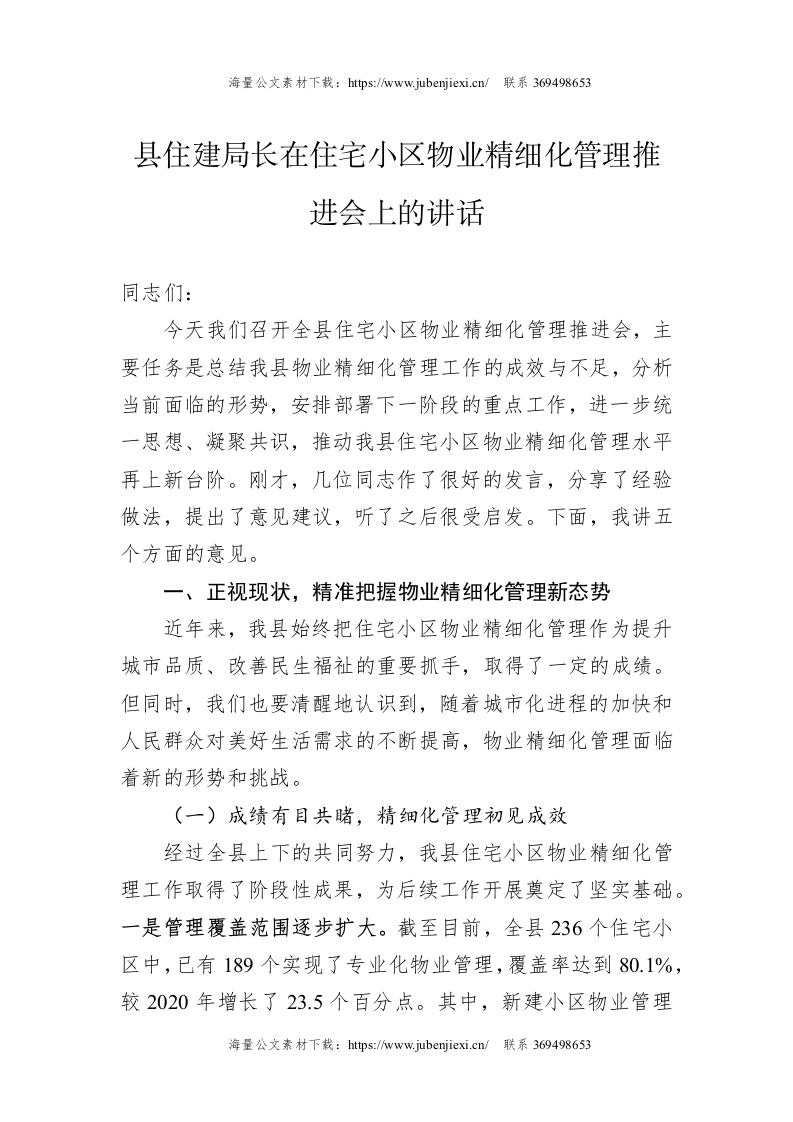 县住建局长在住宅小区物业精细化管理推进会上的讲话