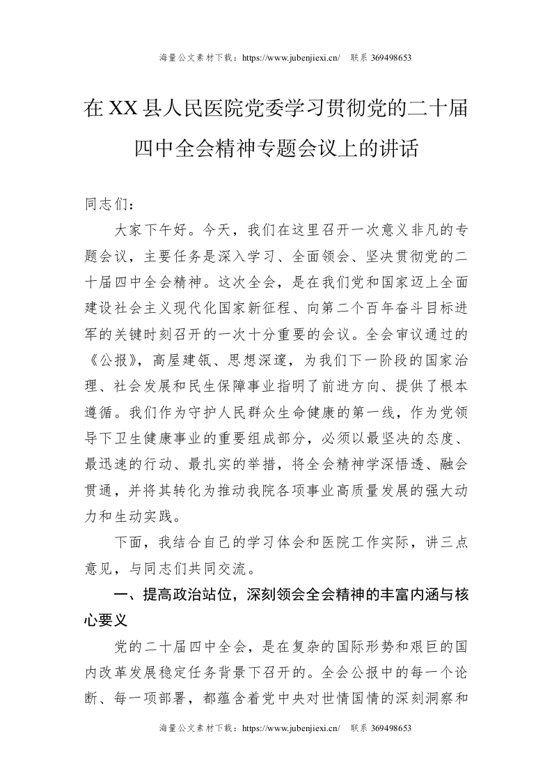 在XX县人民医院党委学习贯彻党的二十届四中全会精神专题会议上的讲话
