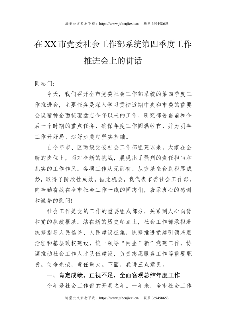 在XX市党委社会工作部系统第四季度工作推进会上的讲话