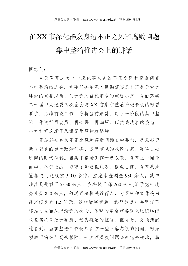 在XX市深化群众身边不正之风和腐败问题集中整治推进会上的讲话
