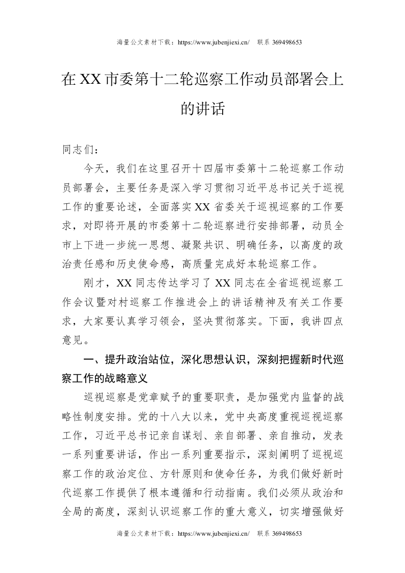 在XX市委第十二轮巡察工作动员部署会上的讲话
