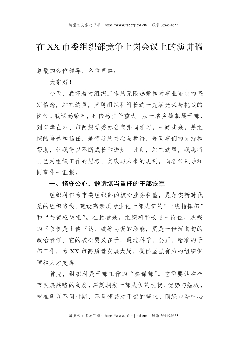 在XX市委组织部竞争上岗会议上的演讲稿