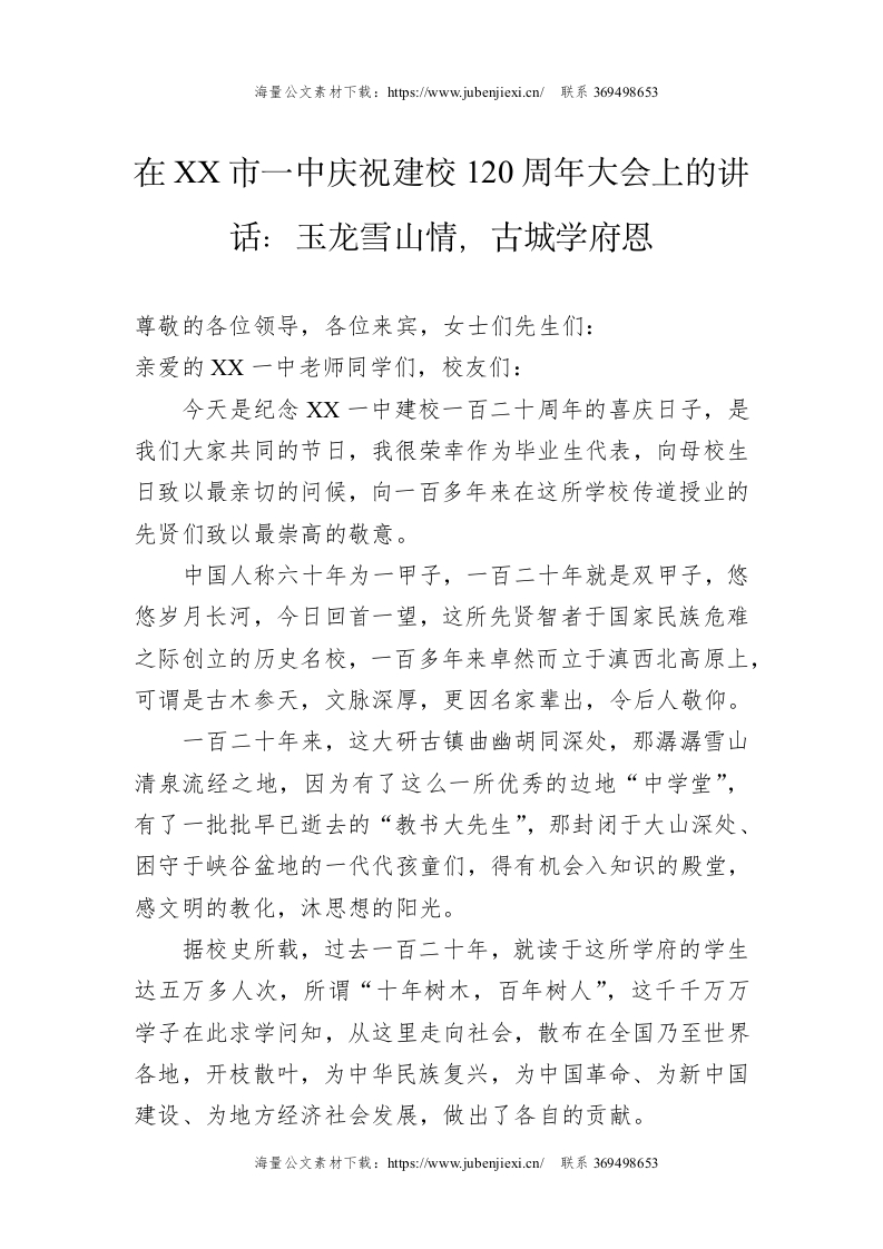 在XX市一中庆祝建校120周年大会上的讲话:玉龙雪山情,古城学府恩