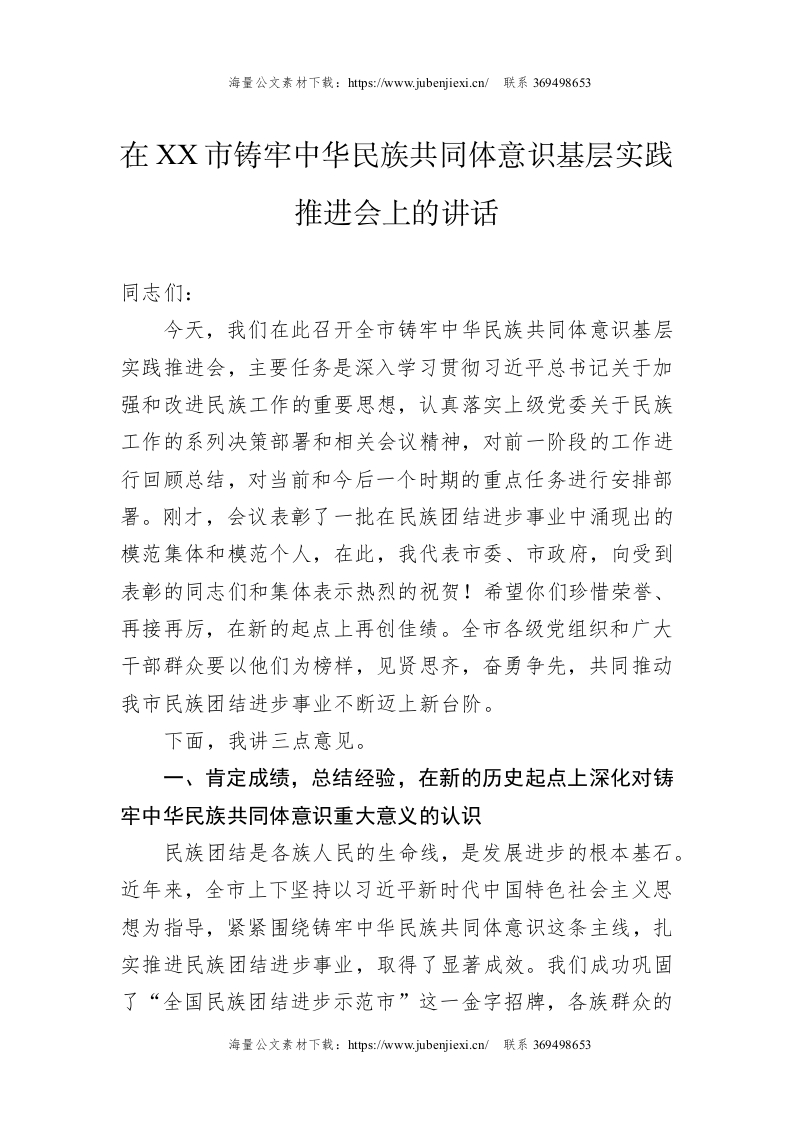 在XX市铸牢中华民族共同体意识基层实践推进会上的讲话