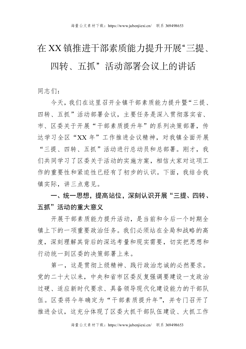 在XX镇推进干部素质能力提升开展“三提、四转、五抓”活动部署会议上的讲话