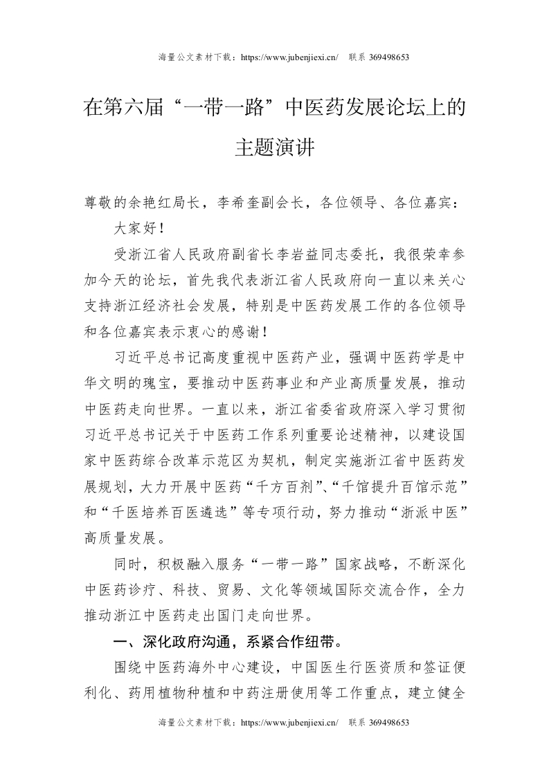 在第六届“一带一路”中医药发展论坛上的主题演讲