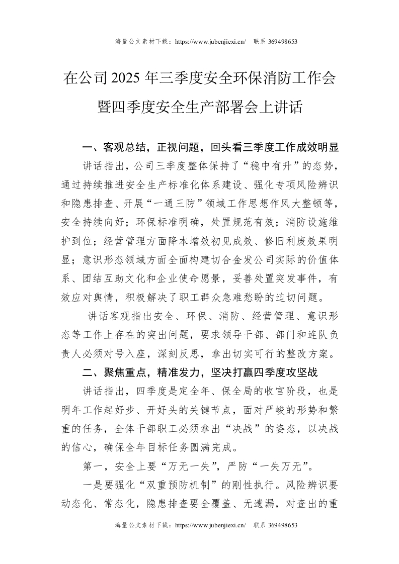 在公司2025年三季度安全环保消防工作会暨四季度安全生产部署会上讲话
