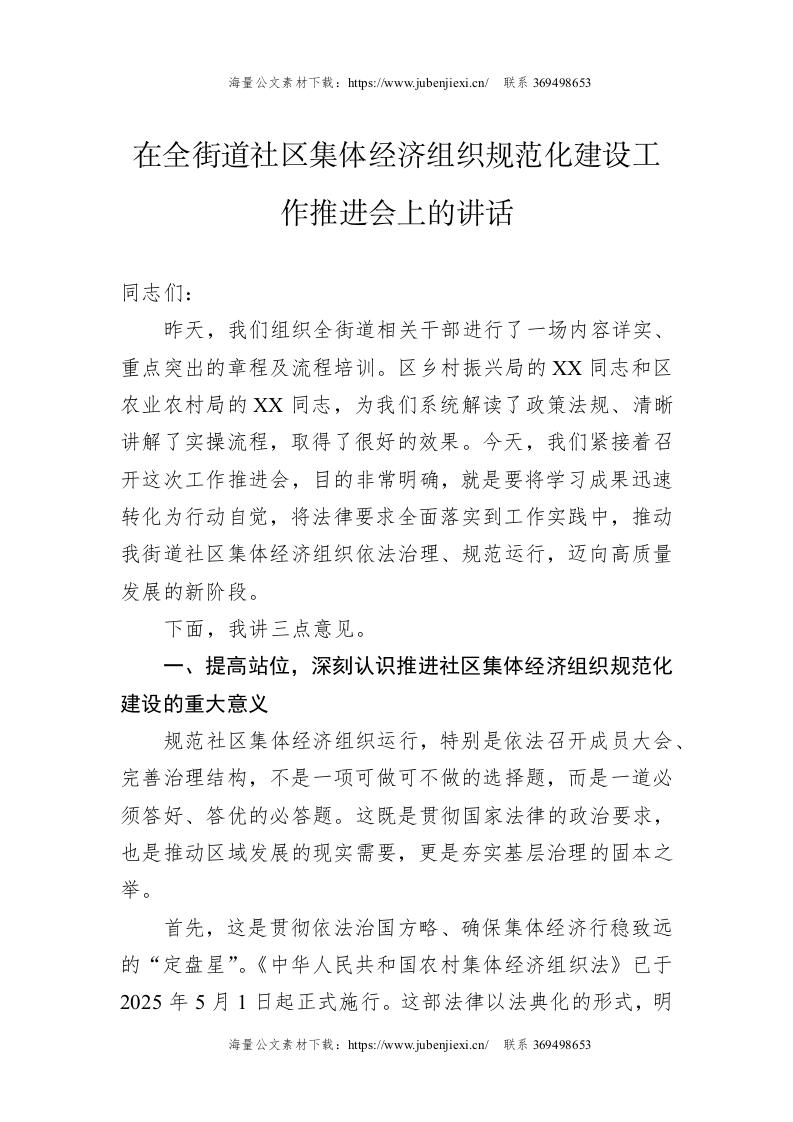 在全街道社区集体经济组织规范化建设工作推进会上的讲话