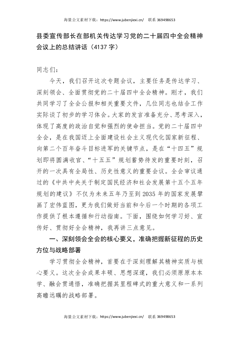县委宣传部长在部机关传达学习党的二十届四中全会精神会议上的总结讲话(4137字)