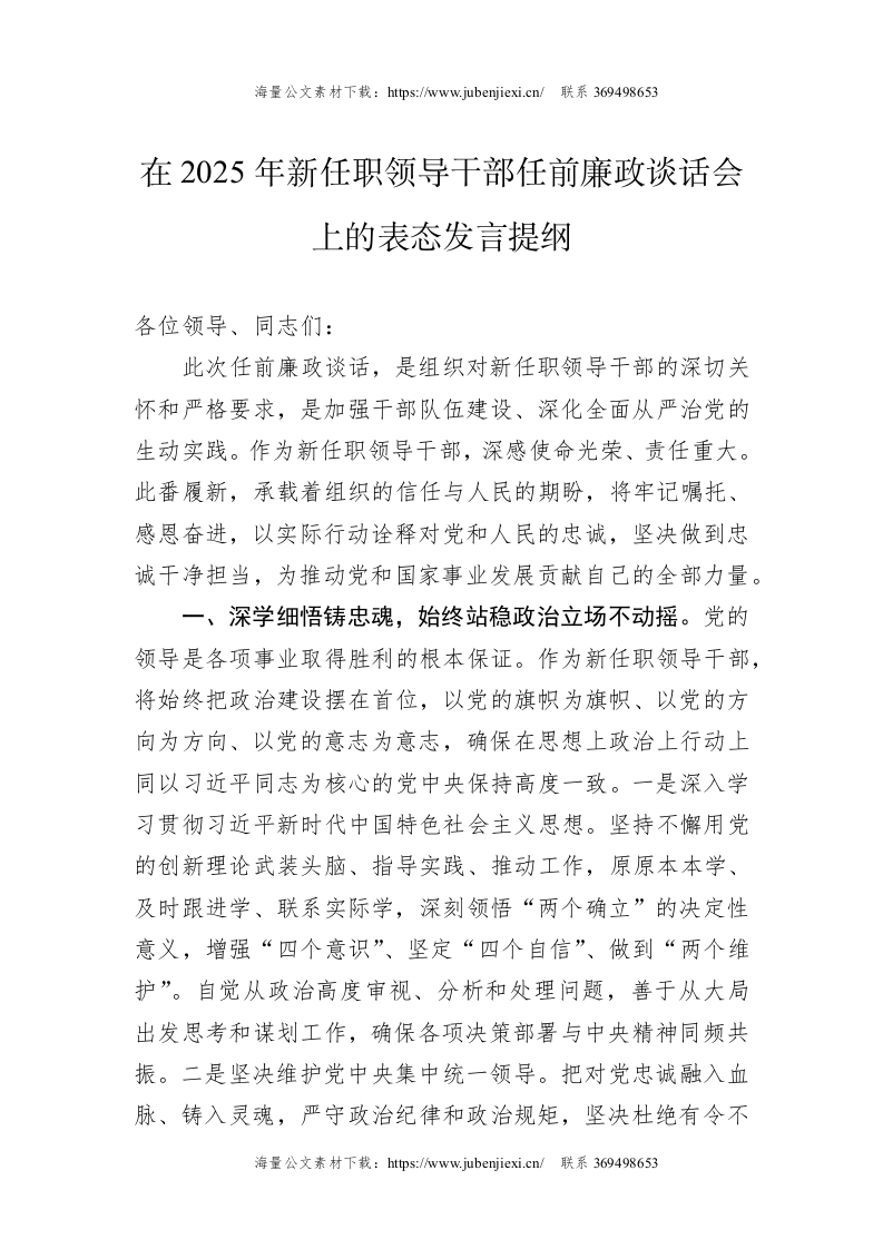 在2025年新任职领导干部任前廉政谈话会上的表态发言提纲