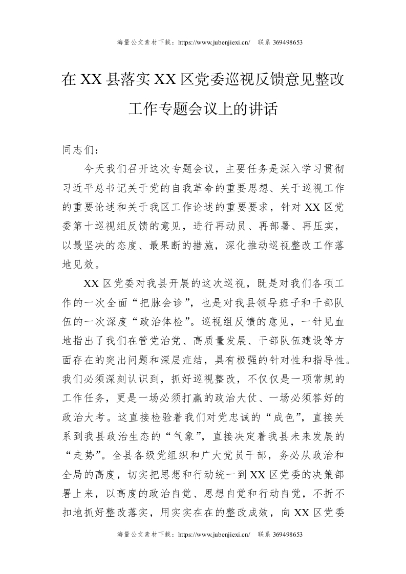 在XX县落实XX区党委巡视反馈意见整改工作专题会议上的讲话