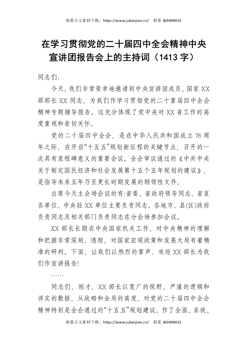在学习贯彻党的二十届四中全会精神中央宣讲团报告会上的主持词(1413字)