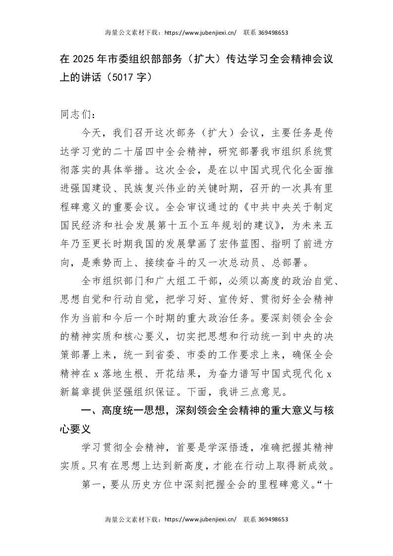 在2025年市委组织部部务(扩大)传达学习全会精神会议上的讲话(5017字)