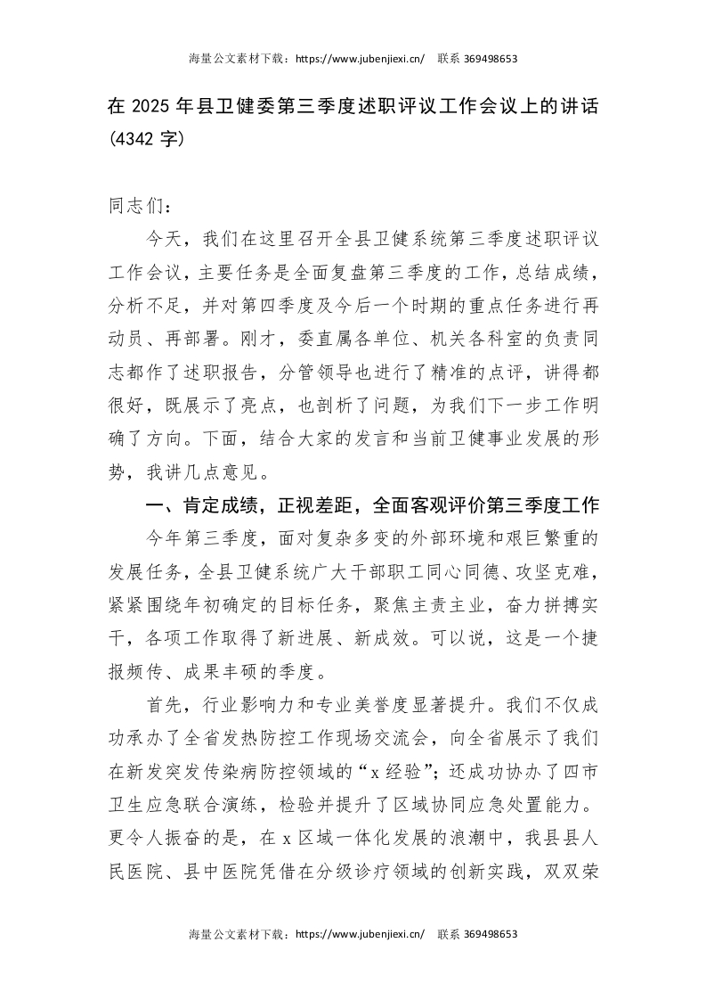 在2025年县卫健委第三季度述职评议工作会议上的讲话(4342字)