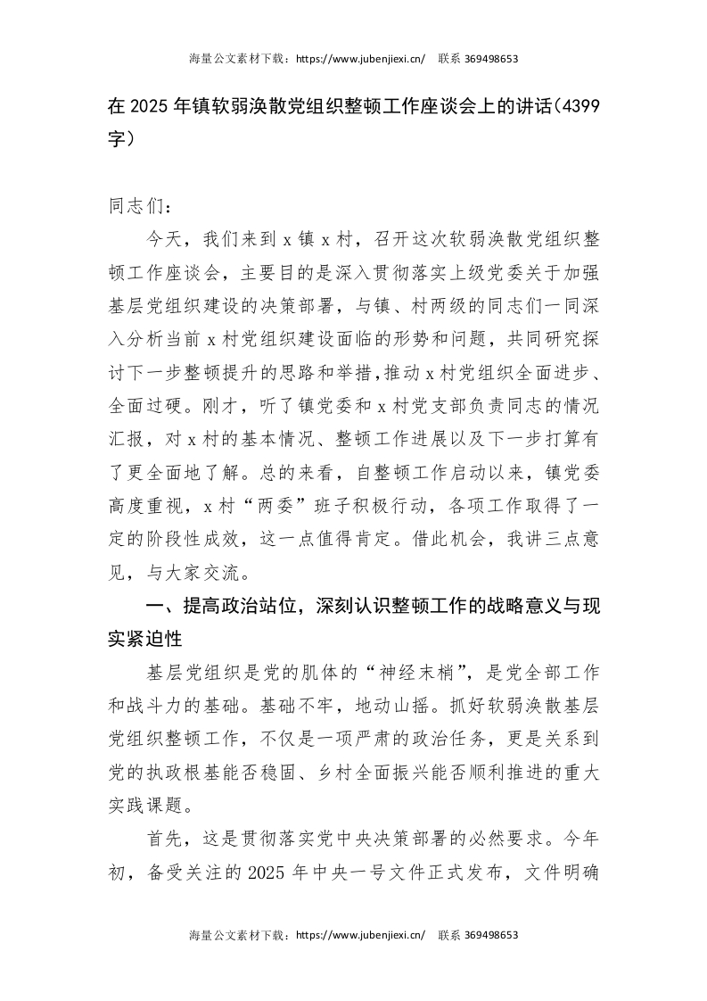 在2025年镇软弱涣散党组织整顿工作座谈会上的讲话(4399字)