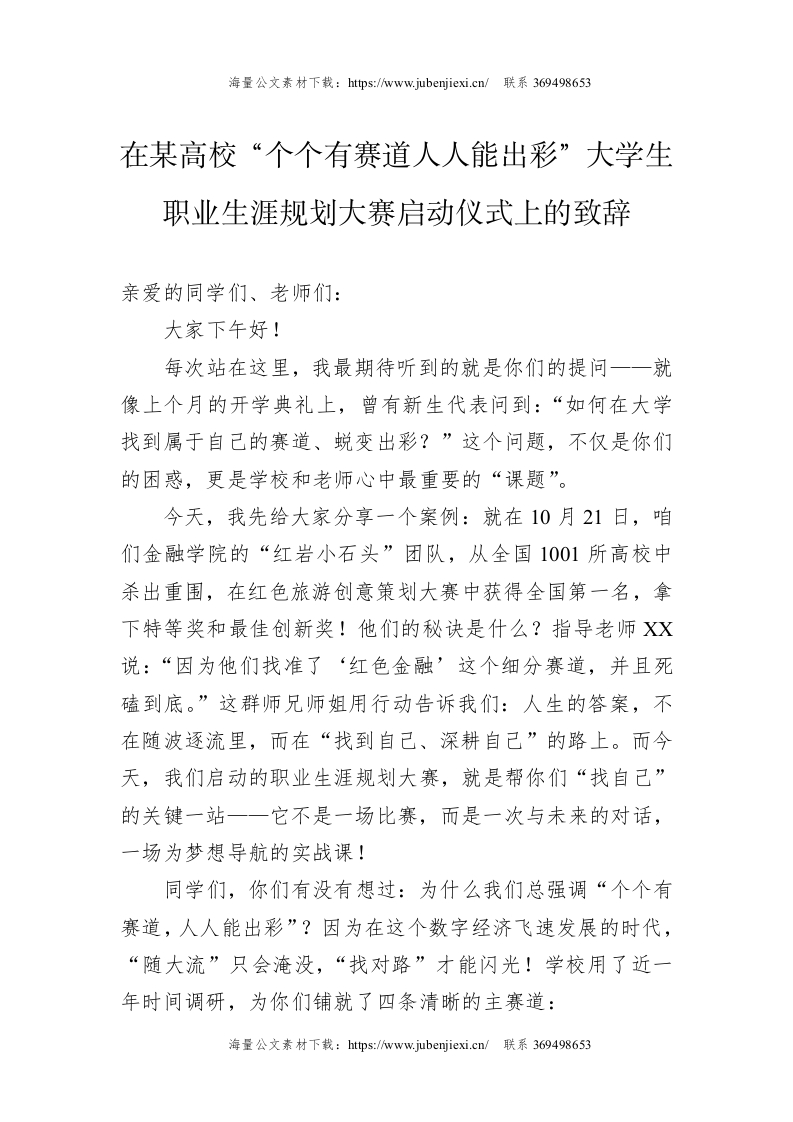 在某高校“个个有赛道人人能出彩”大学生职业生涯规划大赛启动仪式上的致辞