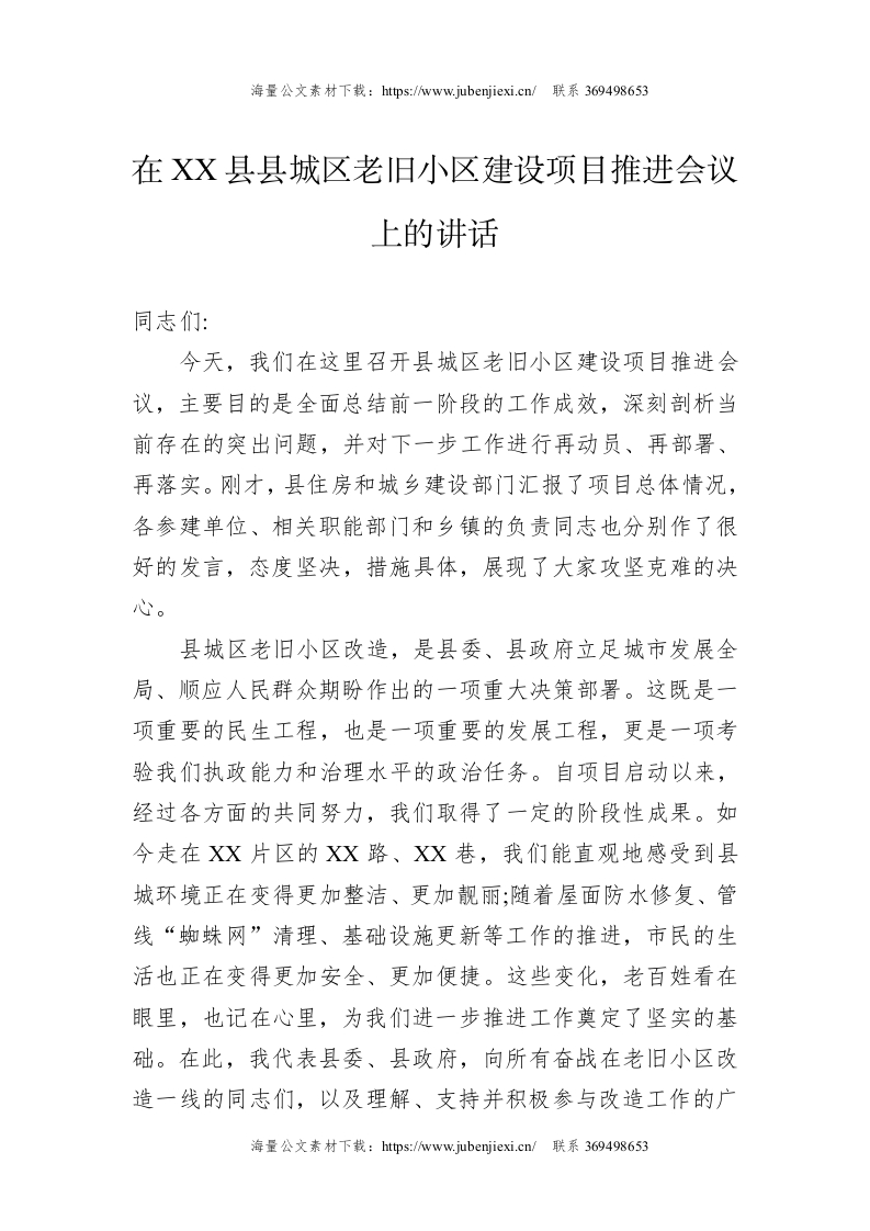 在XX县县城区老旧小区建设项目推进会议上的讲话
