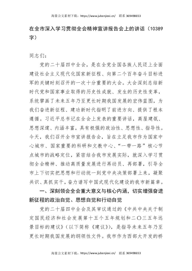 在全市深入学习贯彻全会精神宣讲报告会上的讲话(10389字)