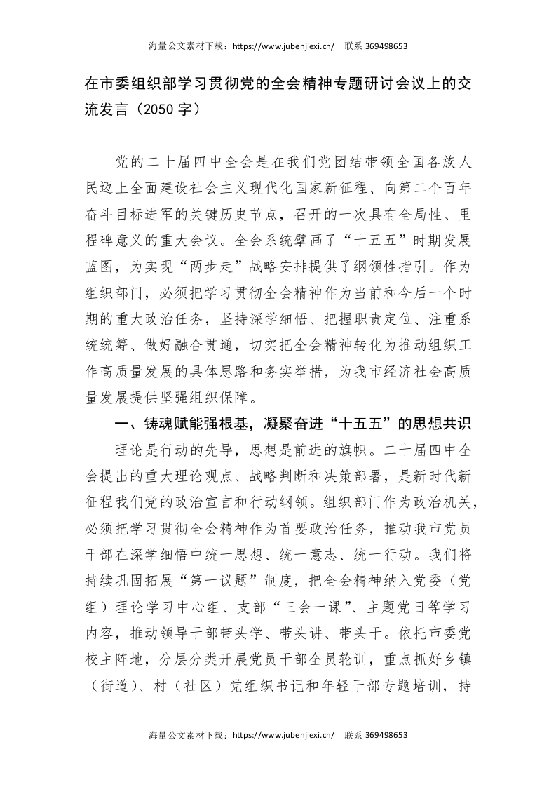在市委组织部学习贯彻党的全会精神专题研讨会议上的交流发言(2050字)