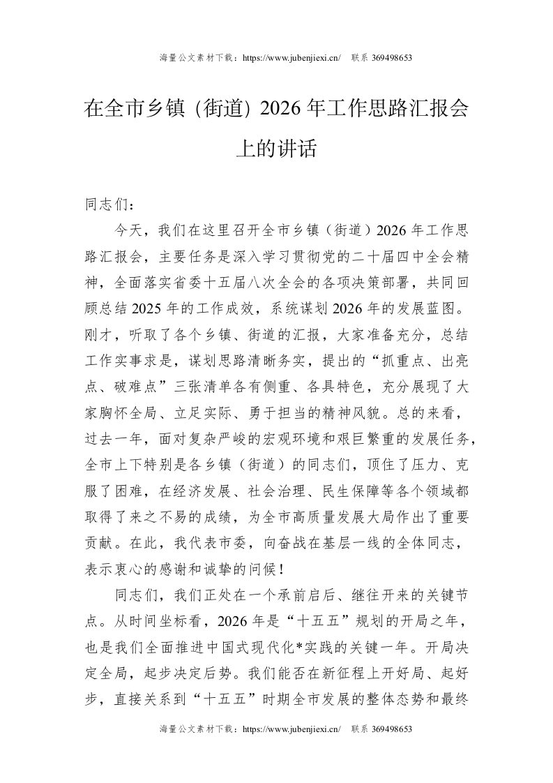 在全市乡镇(街道)2026年工作思路汇报会上的讲话