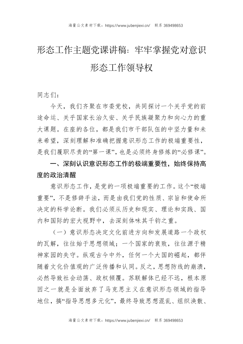 形态工作主题党课讲稿:牢牢掌握党对意识形态工作领导权