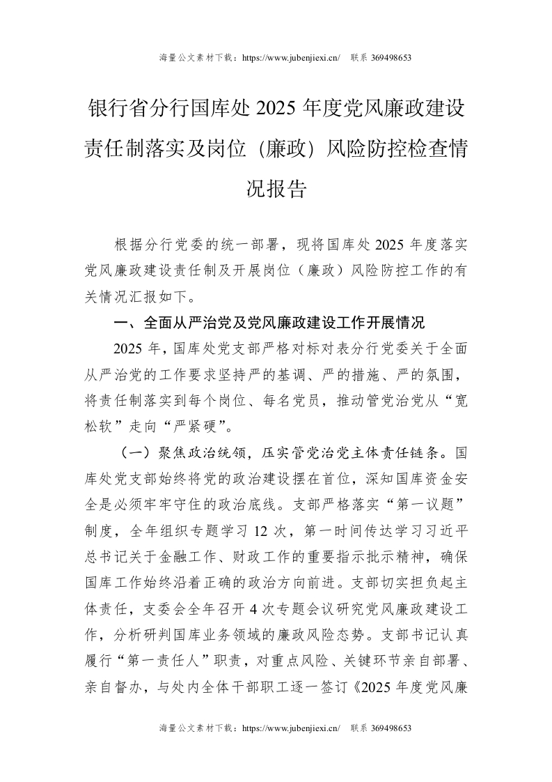 银行省分行国库处2025年度党风廉政建设责任制落实及岗位(廉政)风险防控检查情况报告