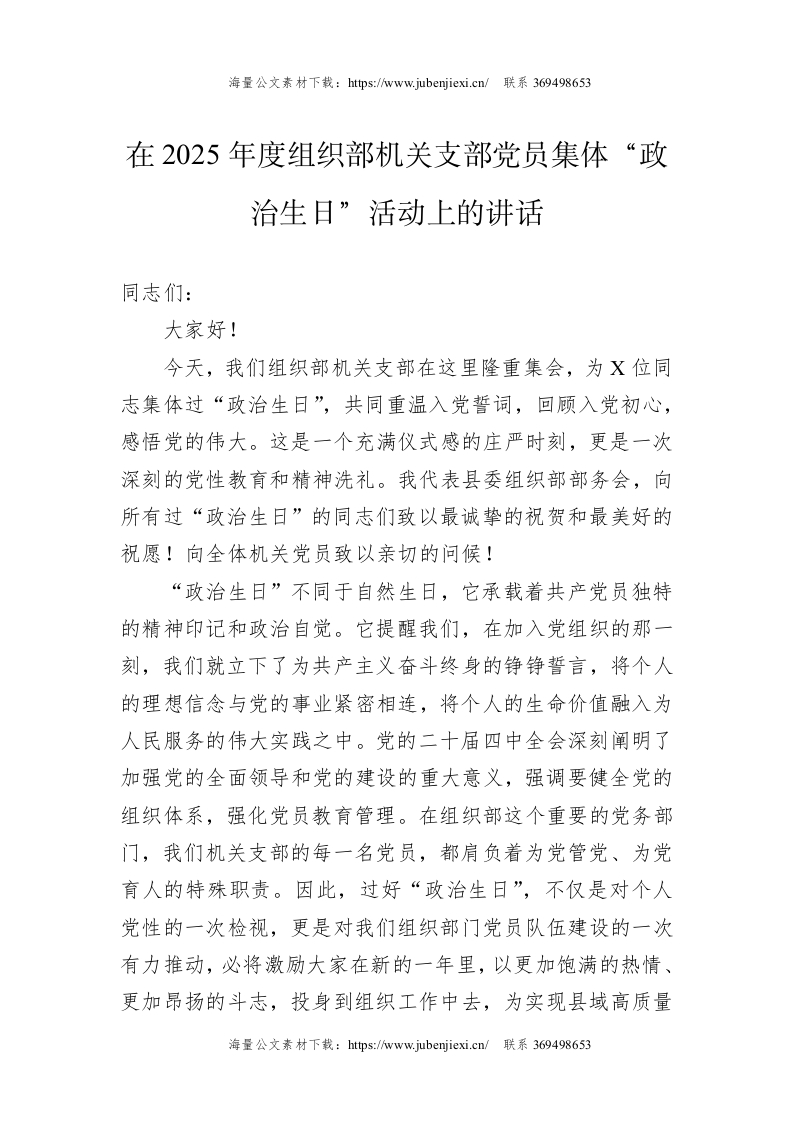 在2025年度组织部机关支部党员集体“政治生日”活动上的讲话