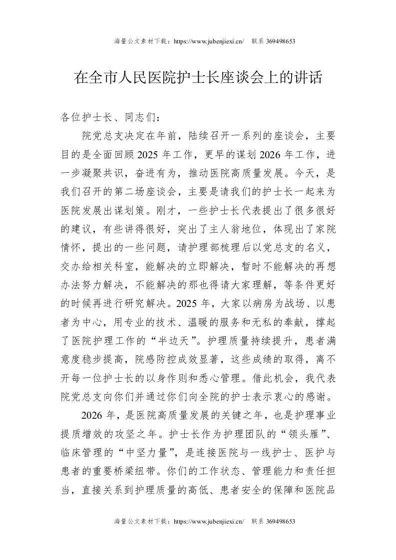 在全市人民医院护士长座谈会上的讲话
