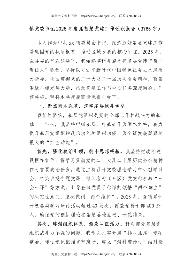 镇党委书记2025年度抓基层党建工作述职报告(3765字)