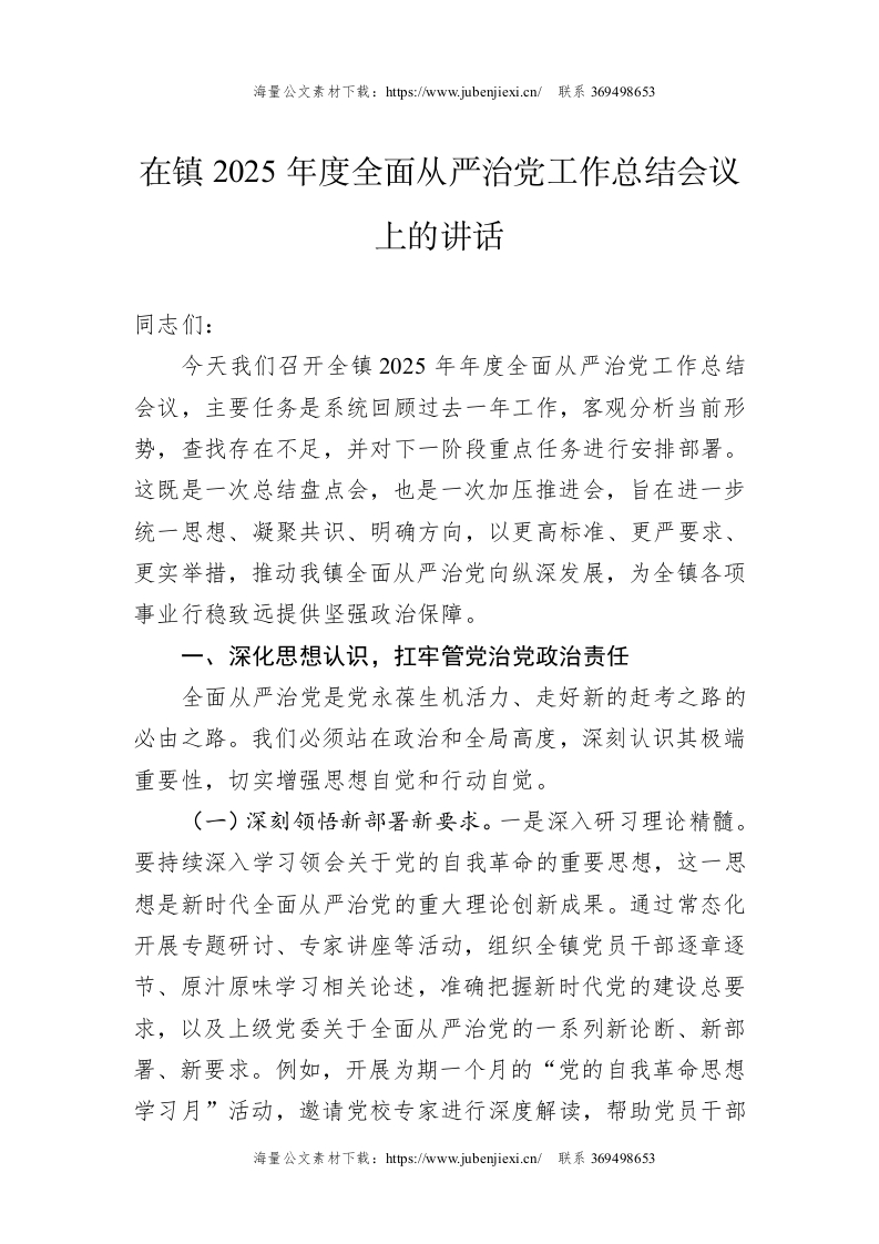 在镇2025年度全面从严治党工作总结会议上的讲话