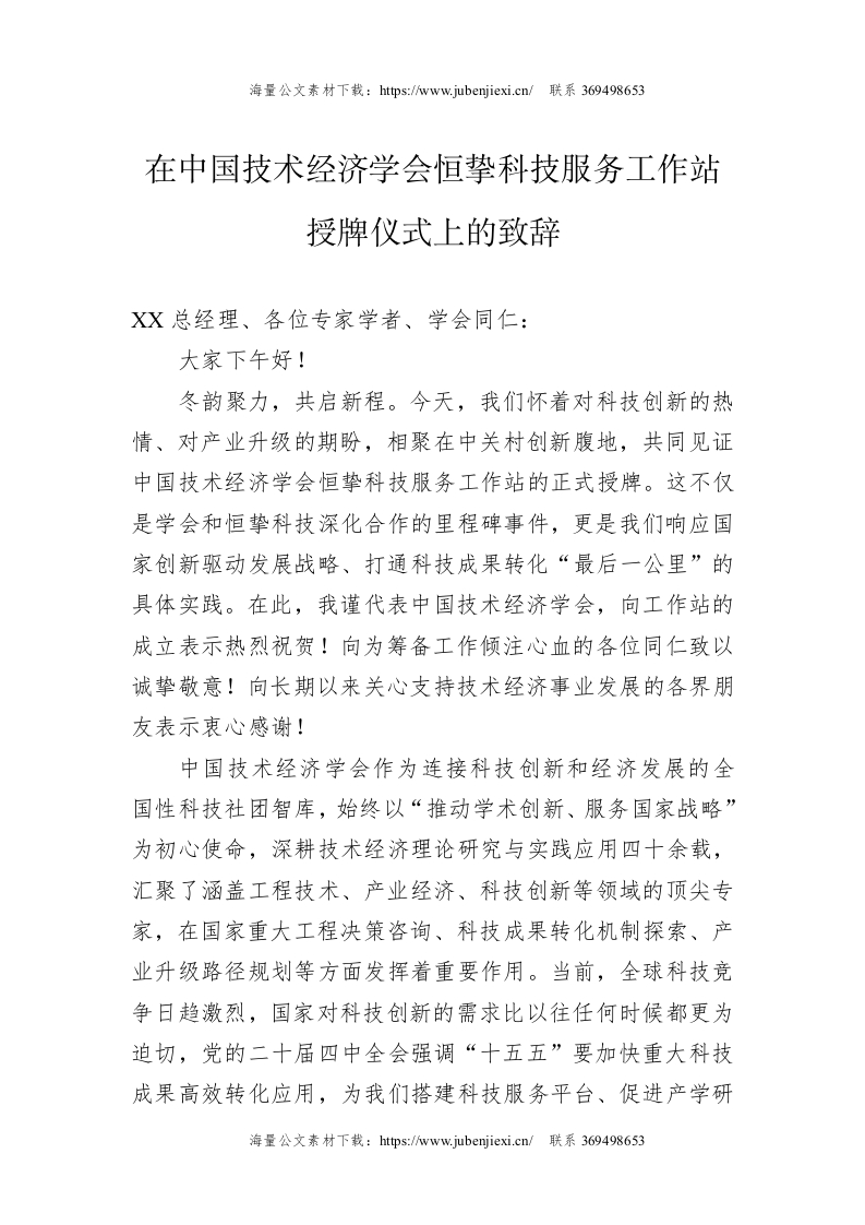 在中国技术经济学会恒挚科技服务工作站授牌仪式上的致辞