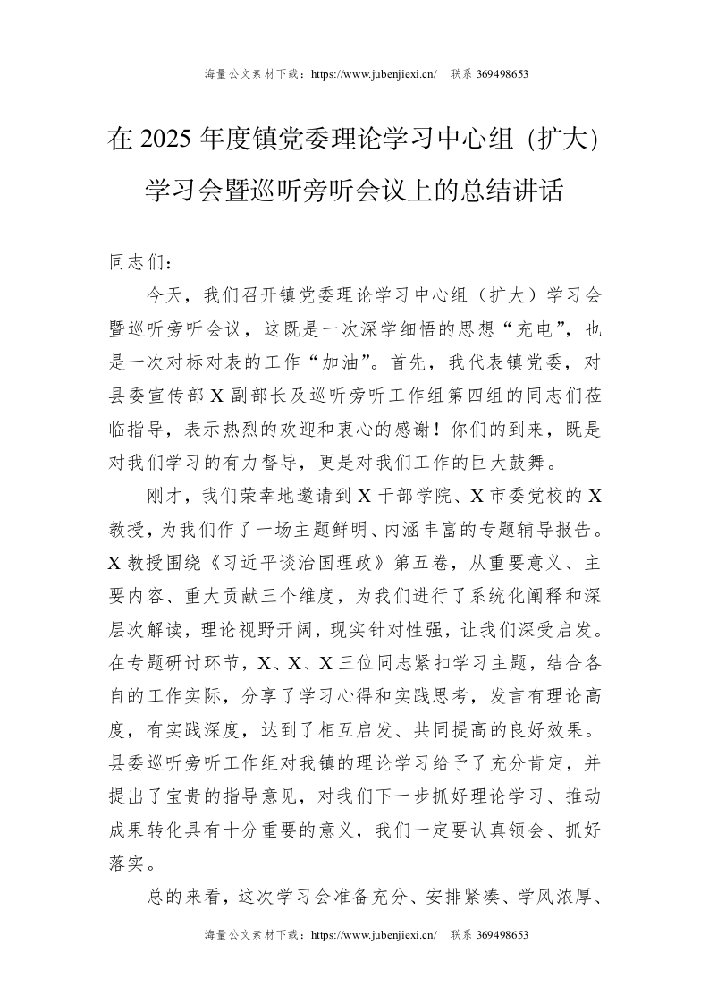 在2025年度镇党委理论学习中心组(扩大)学习会暨巡听旁听会议上的总结讲话