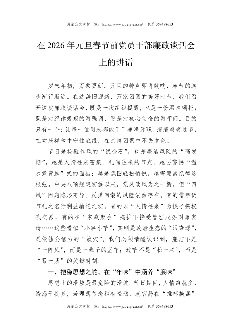 在2026年元旦春节前党员干部廉政谈话会上的讲话