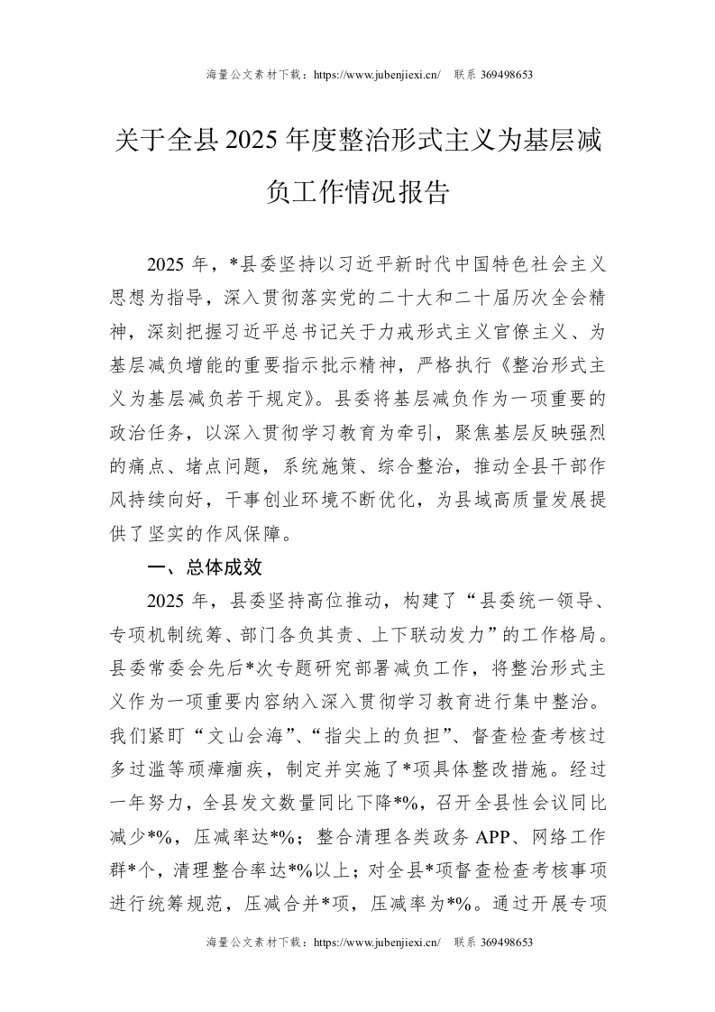 首页公文大全近期更新关于全县2025年度整治形式主义为基层减负工作情况报告