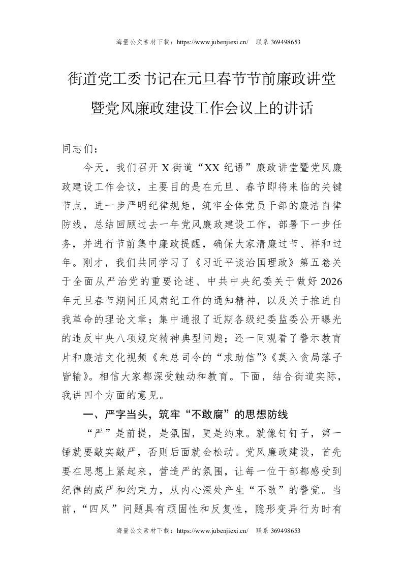 街道党工委书记在元旦春节节前廉政讲堂暨党风廉政建设工作会议上的讲话