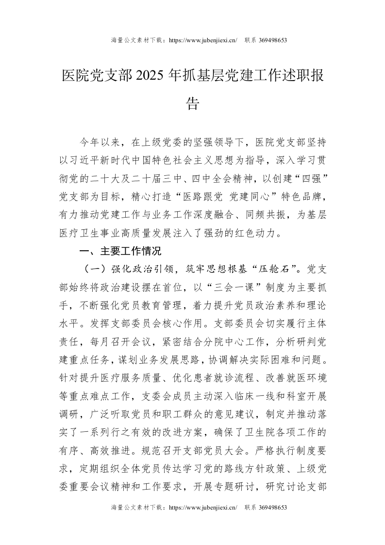 医院党支部2025年抓基层党建工作述职报告