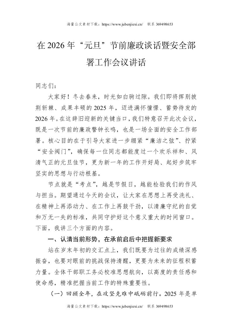 在2026年“元旦”节前廉政谈话暨安全部署工作会议讲话