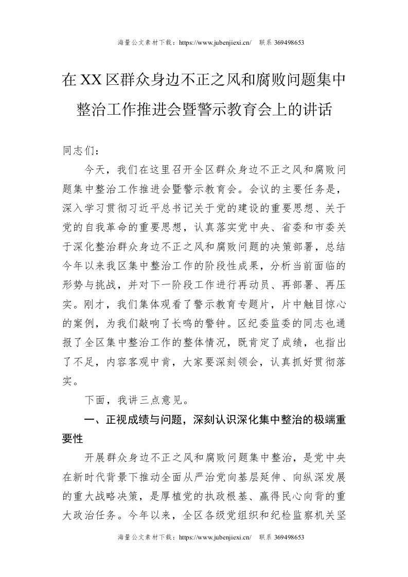 在XX区群众身边不正之风和腐败问题集中整治工作推进会暨警示教育会上的讲话
