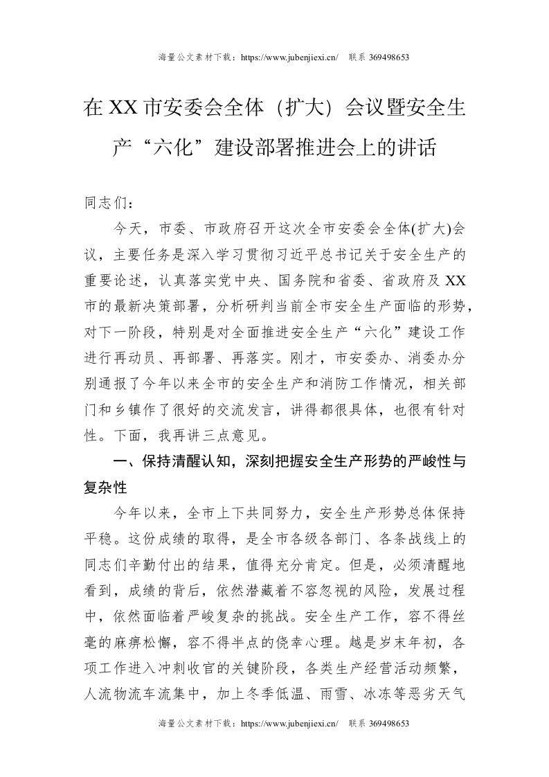 在XX市安委会全体(扩大)会议暨安全生产“六化”建设部署推进会上的讲话