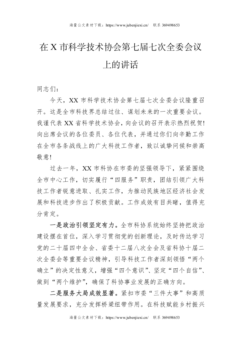 在X市科学技术协会第七届七次全委会议上的讲话