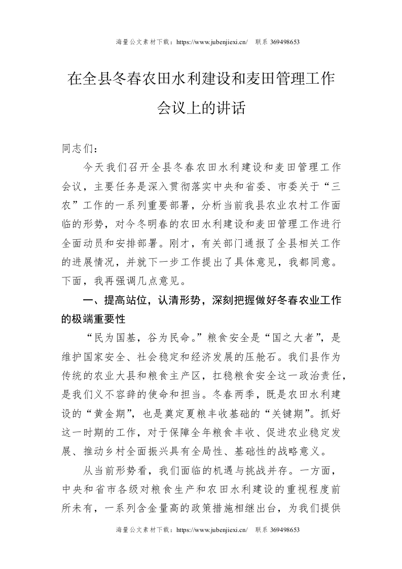 在全县冬春农田水利建设和麦田管理工作会议上的讲话