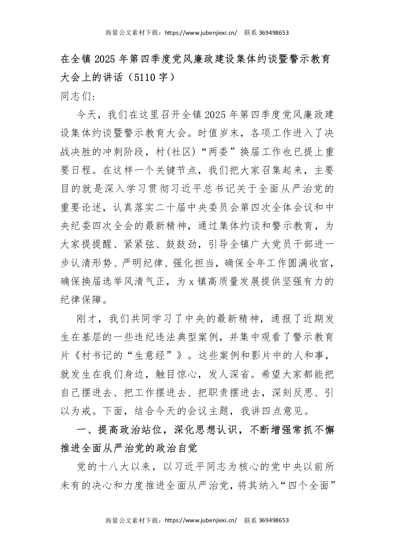 在全镇2025年第四季度党风廉政建设集体约谈暨警示教育大会上的讲话(5110字)