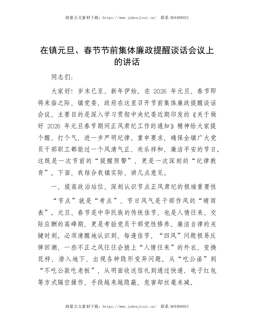在镇元旦、春节节前集体廉政提醒谈话会议上的讲话